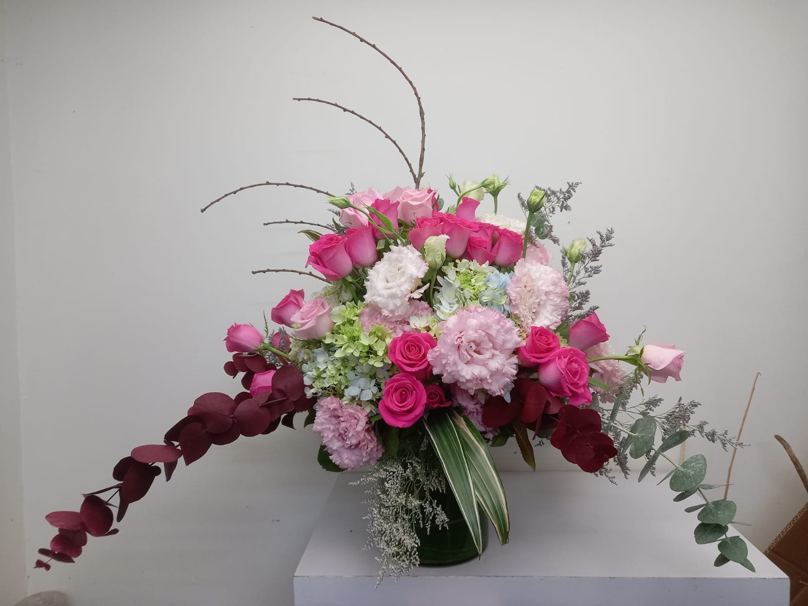 Arreglo de Rosas Fuisha y Rosa, Lisianhus, Hortensia