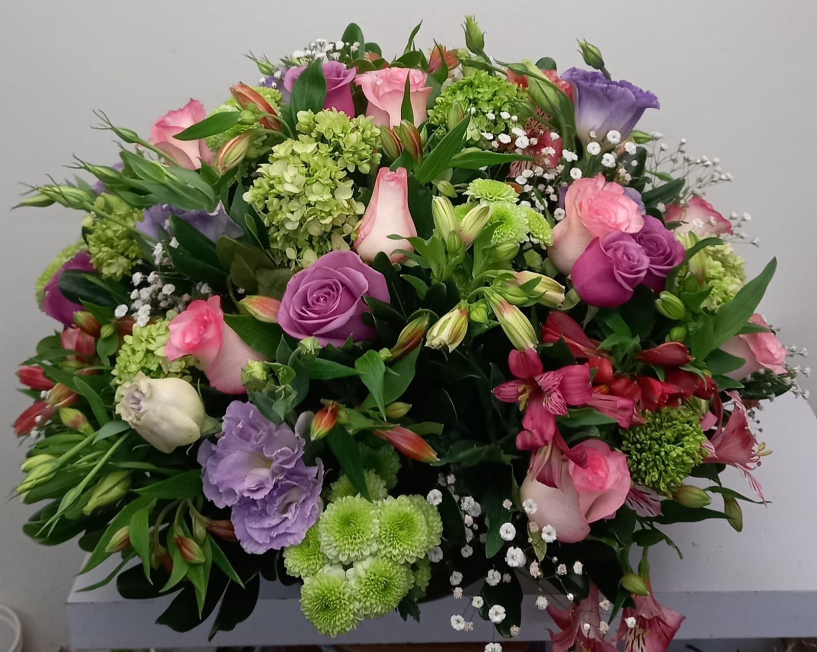 Arreglo redondo con Rosas de 2 tonos, Alstroemeria, Hortensia, Gisophila y Lisianthus