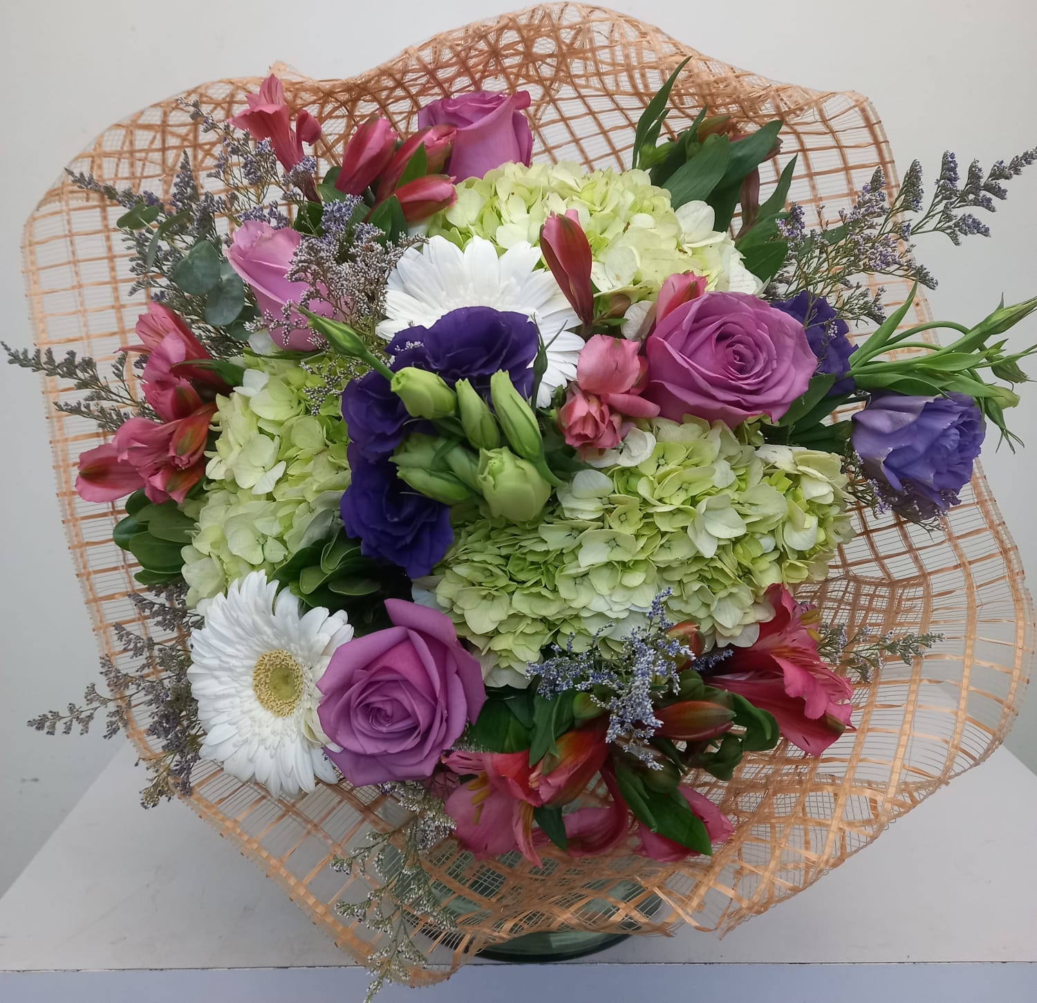 Ramo floral elegante y armonioso que combina hortensias verdes, rosas en tonos lila, gerberas blancas y delicados acentos en púrpura y rosa.